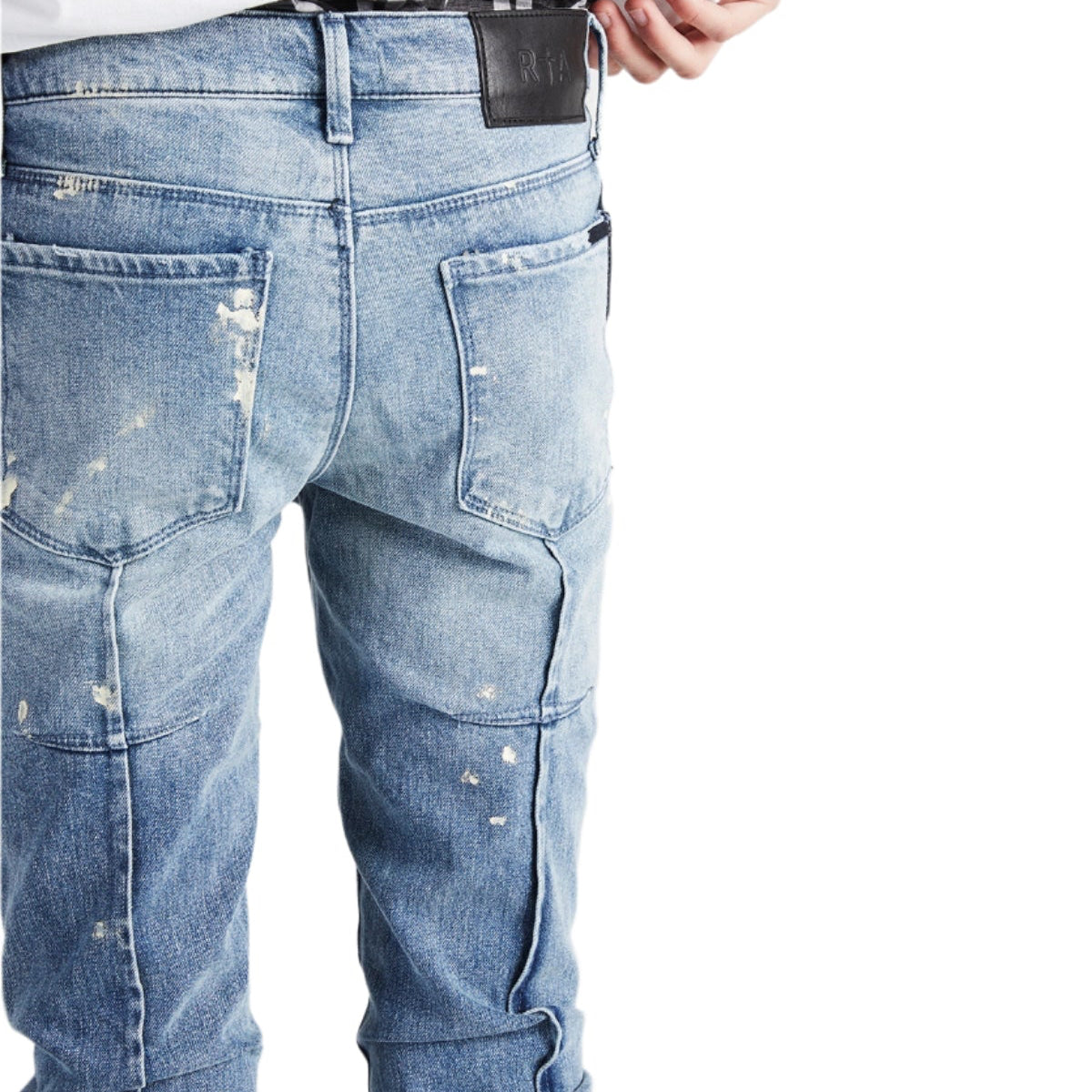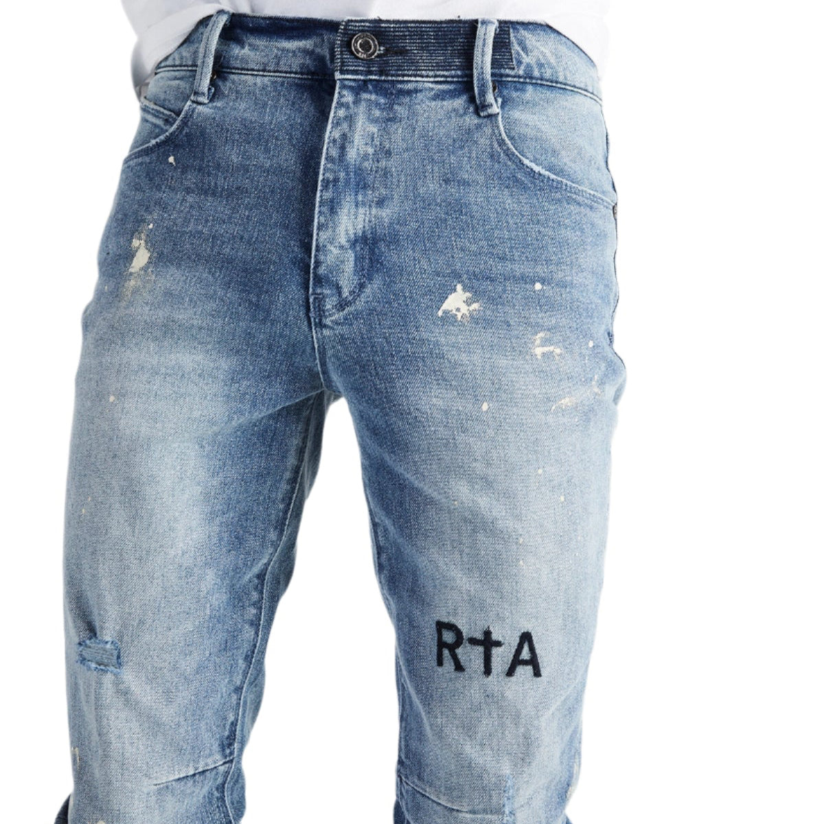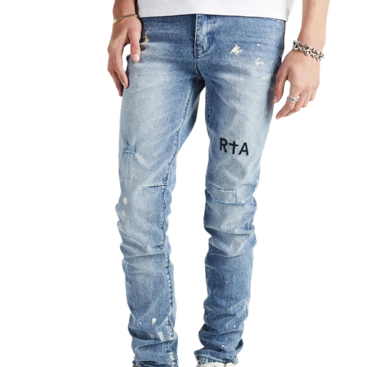 The RTA Clayton Jean in distressed white paint denim features our classic fit, a skinny 5 pocket silhouette, embroidered contrast white RTA logo on front and signature pintuck dagger seams along back legs. This jean is unique, has rips along with distressing and white paint splatter.