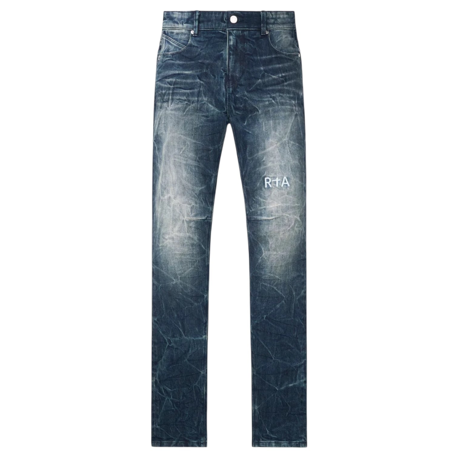 These jeans feature a worn-in, vintage wash, RTA logo embroidered on the leg, the iconic RA cross on the back pocket, signature leather patch on the back waistband, and pin-tuck dagger seams down the back legs.