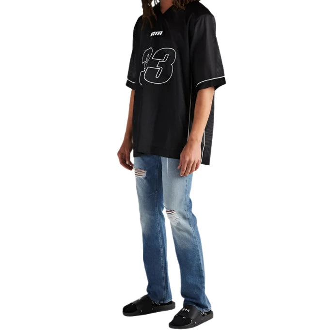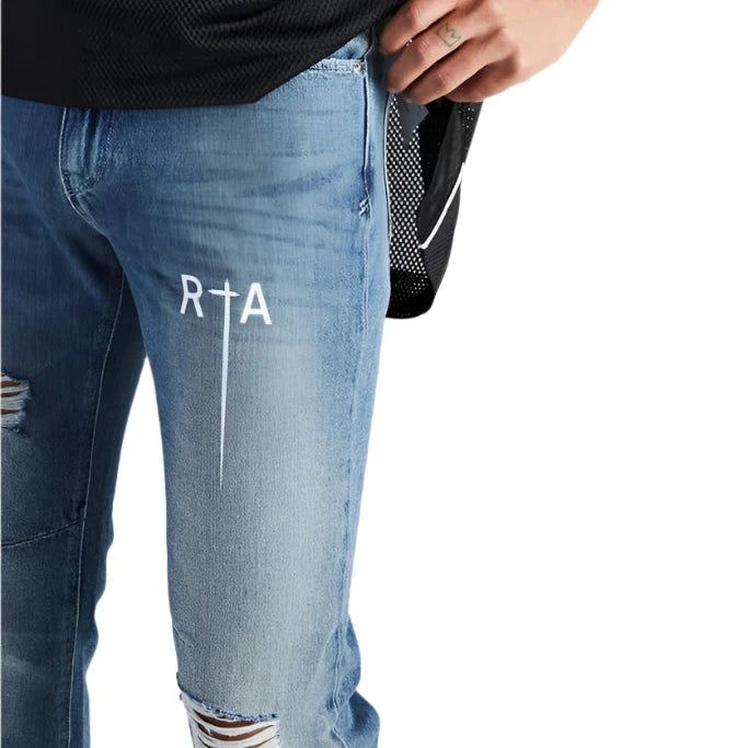 The Denis flared skinny jean, with a slight stretch, presented in a medium blue distressed wash. Features stitched detail at the waistband and a stylized black RTA logo on the rear pocket.
