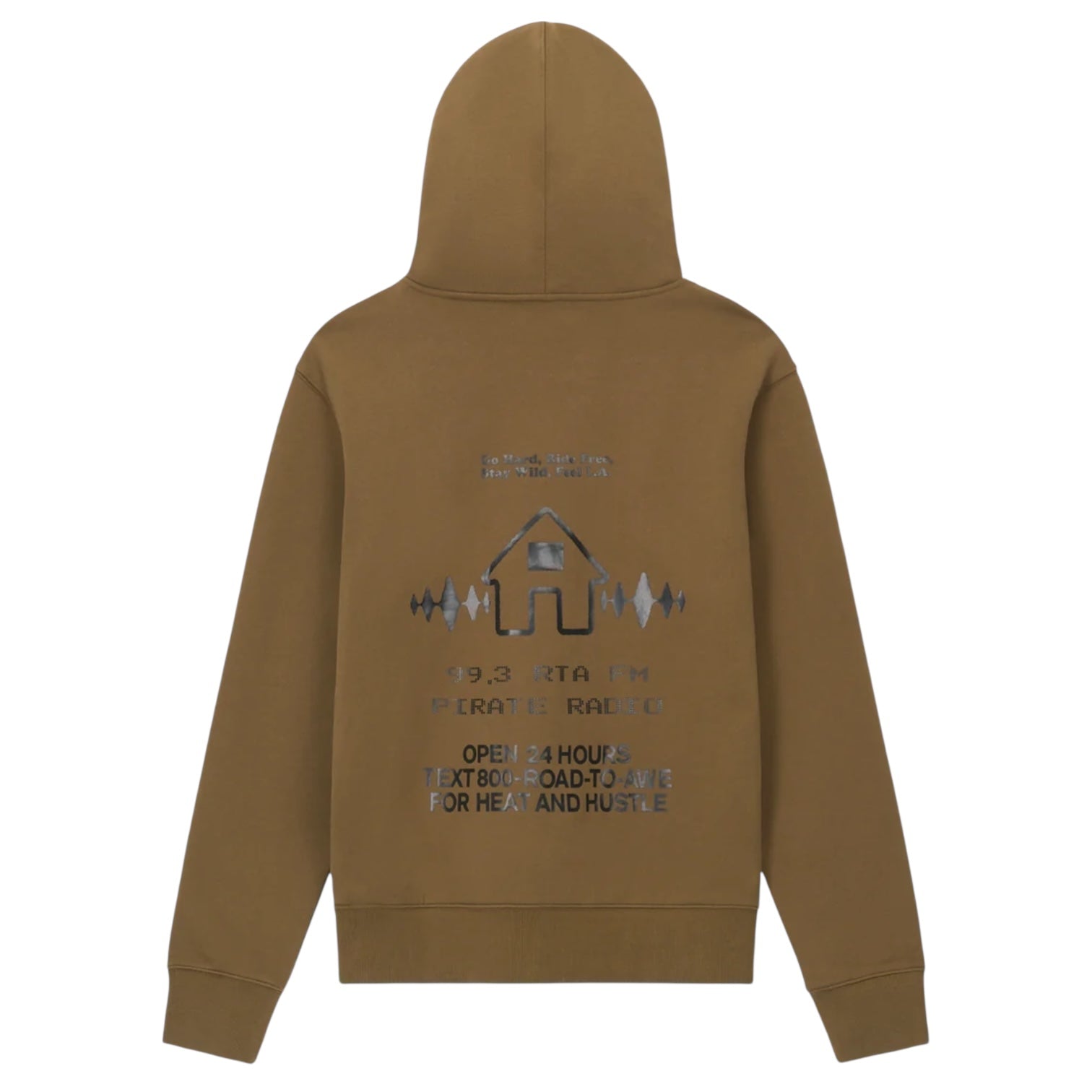 The Dion Hoodie in Teak Radio House is made from 100% Cotton. Designed with reinforced, coated drawstrings, kangaroo pocket, and a ribbed waistband and cuffs. This hoodie features a fading dot RTA logo across the chest and original RTA radio house graphics on the back.