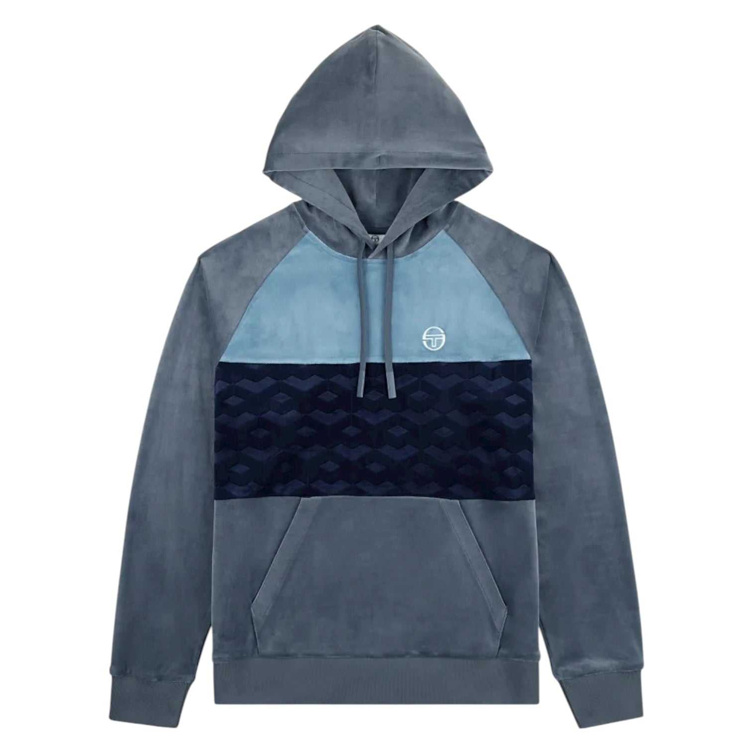 Unleash your playful side with the Sergio Tacchini Foggia Velour Debossed Pull Over Hoodie. Crafted from super plush velour, this premium hoodie features a debossed geometric motif for a touch of luxury. Stay cozy and stylish with the color-blocked silhouette, spacious kangaroo pocket, and embroidered 'ST' monogram logo.