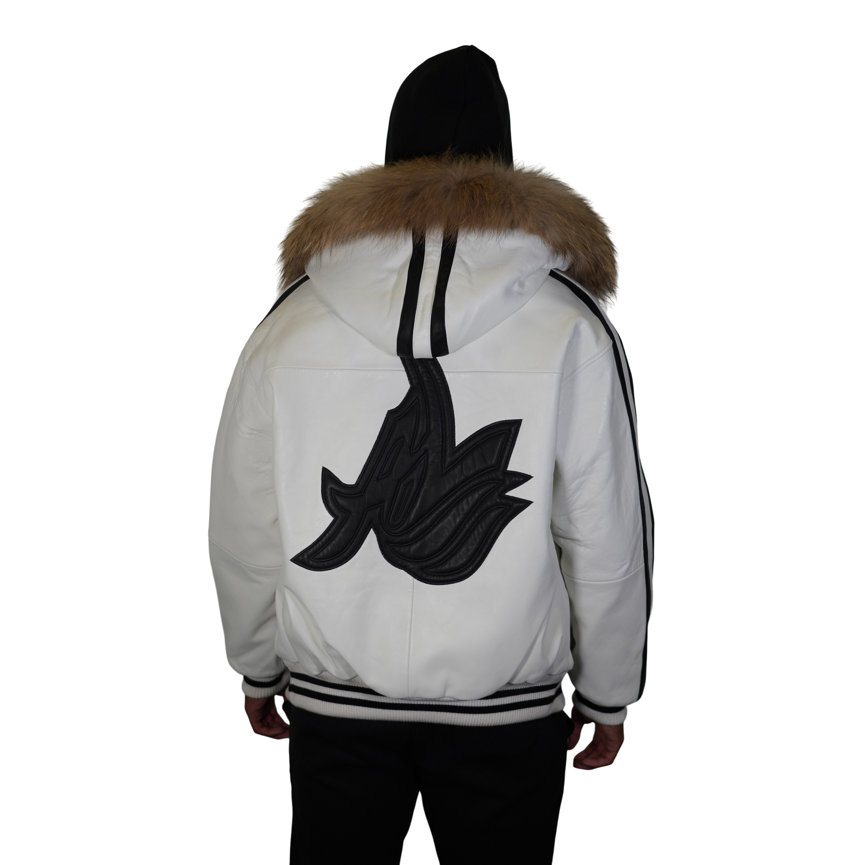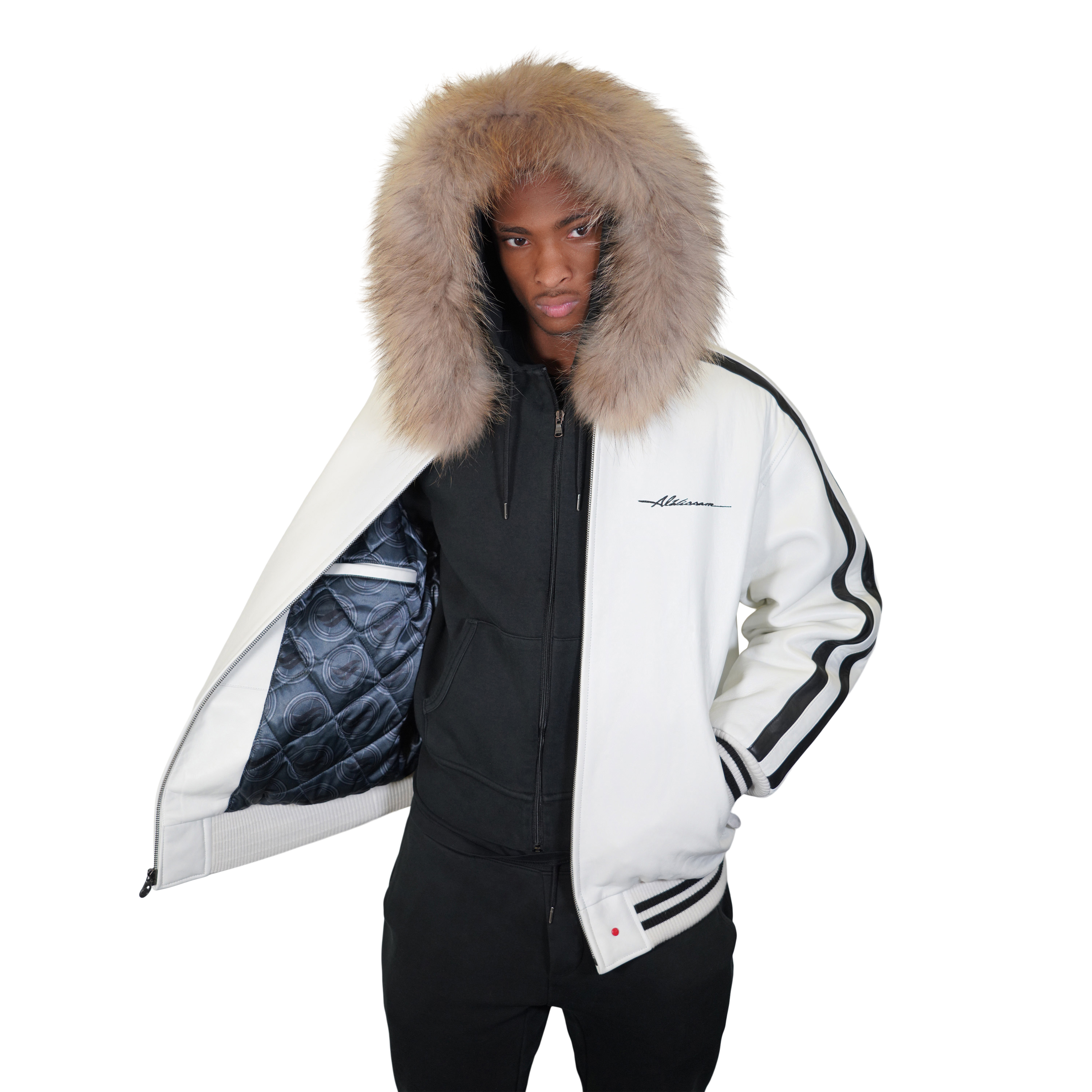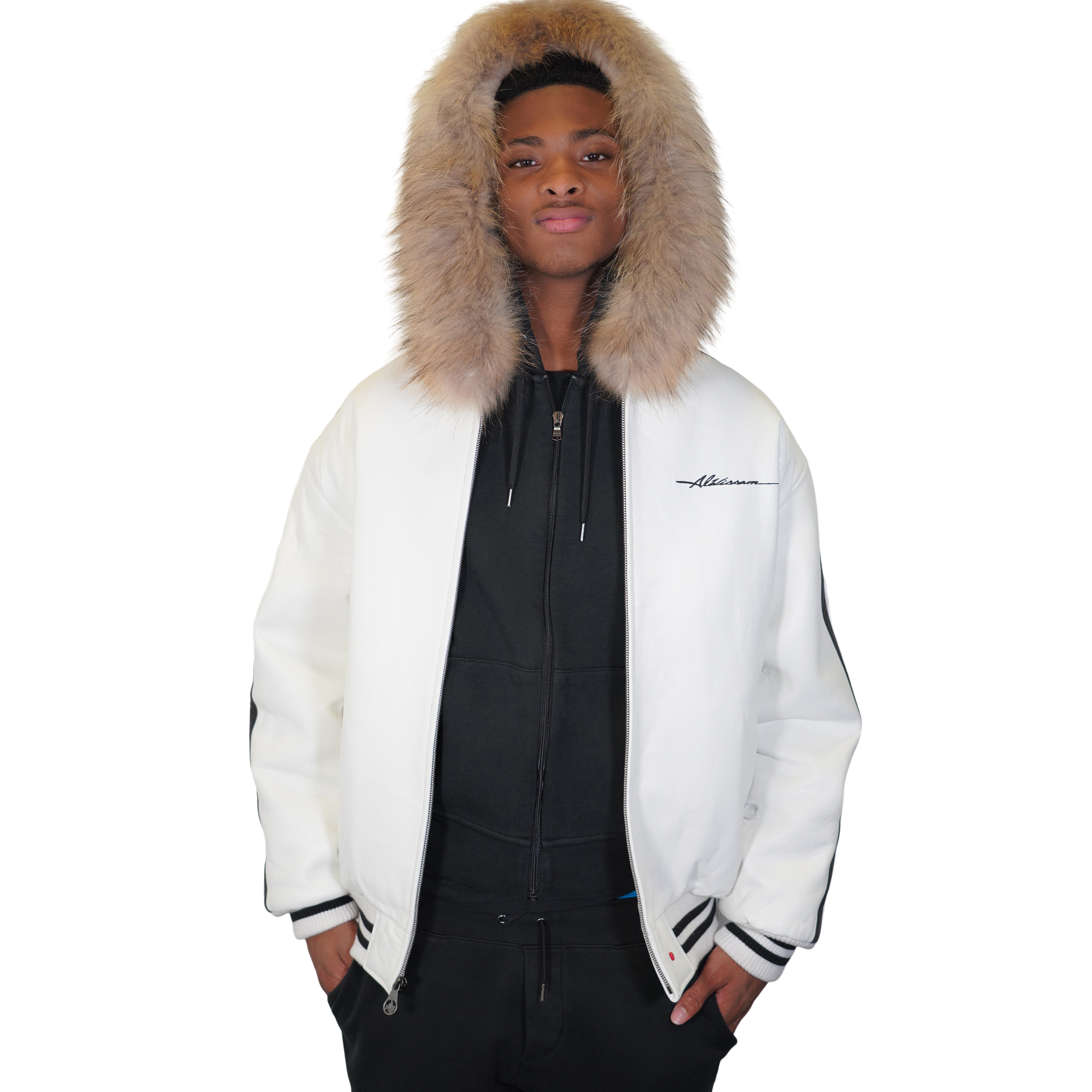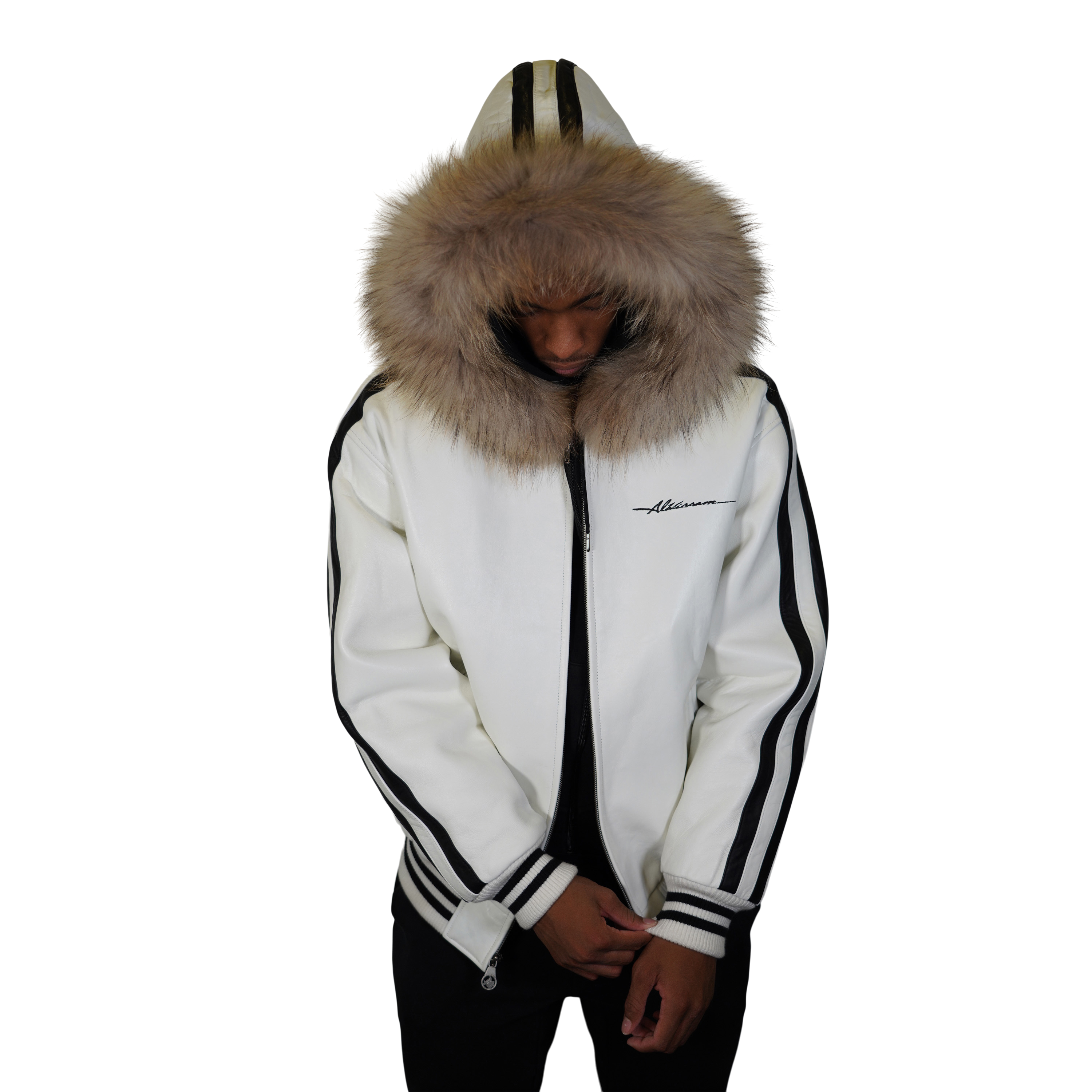 Elevate your winter wardrobe with the "Fur-Trimmed Leather Bomber Jacket" – a true masterpiece of style and warmth. Crafted from 100% genuine leather, this jacket exudes luxury and sophistication. With its plush fur hood, leather stripes on the sleeves and hood, and the iconic AL logo on the back, it's more than just a jacket; it's a symbol of your impeccable taste.
