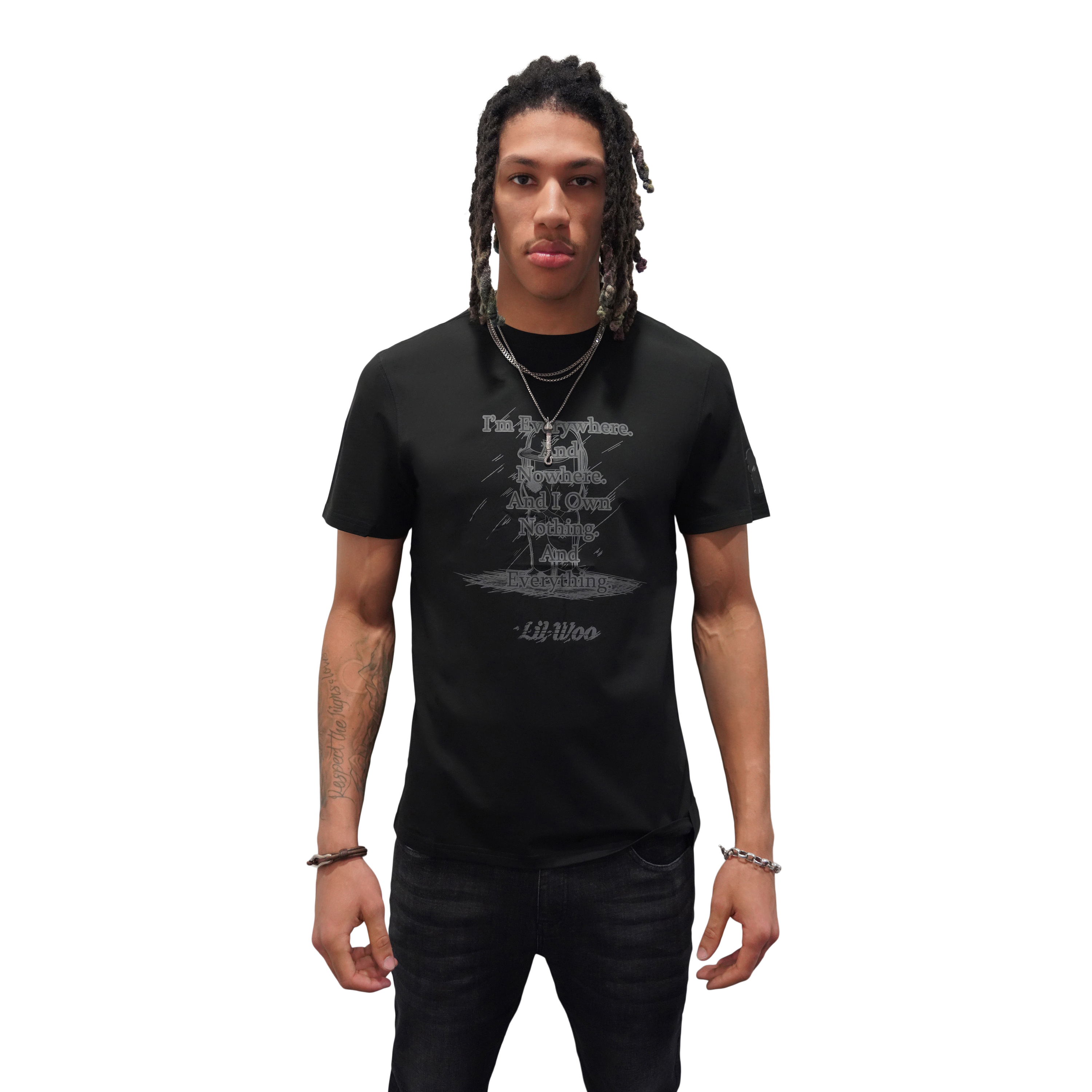 This tee embraces paradox with its thought-provoking message: "I'm Everywhere and No Where. And I own Nothing. And Everything." It embodies the essence of Lil Woo, who transcends conventional boundaries and defies easy definition. It's a reminder that true ownership lies in the intangible, in the experiences and moments that shape our lives.