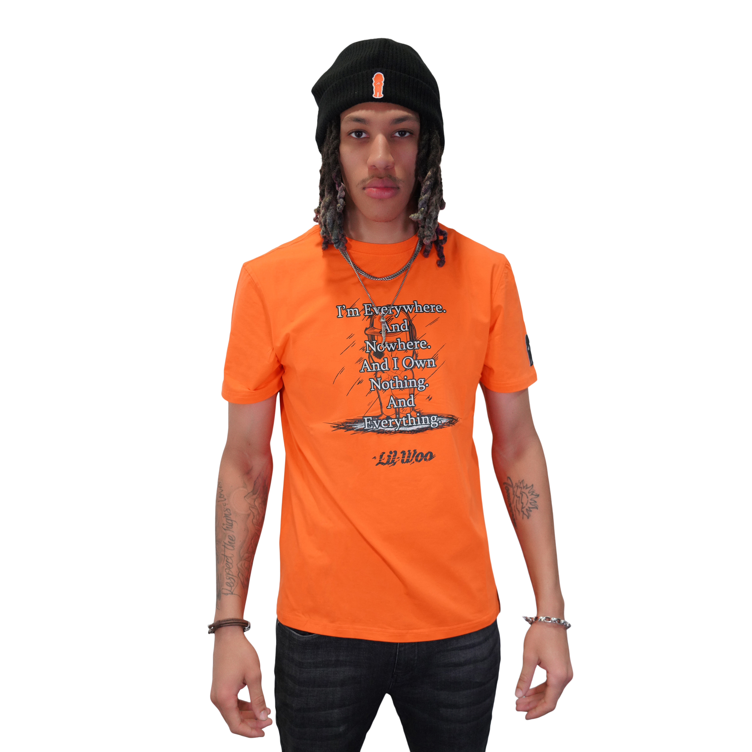 This tee embraces paradox with its thought-provoking message: "I'm Everywhere and No Where. And I own Nothing. And Everything." It embodies the essence of Lil Woo, who transcends conventional boundaries and defies easy definition. It's a reminder that true ownership lies in the intangible, in the experiences and moments that shape our lives.