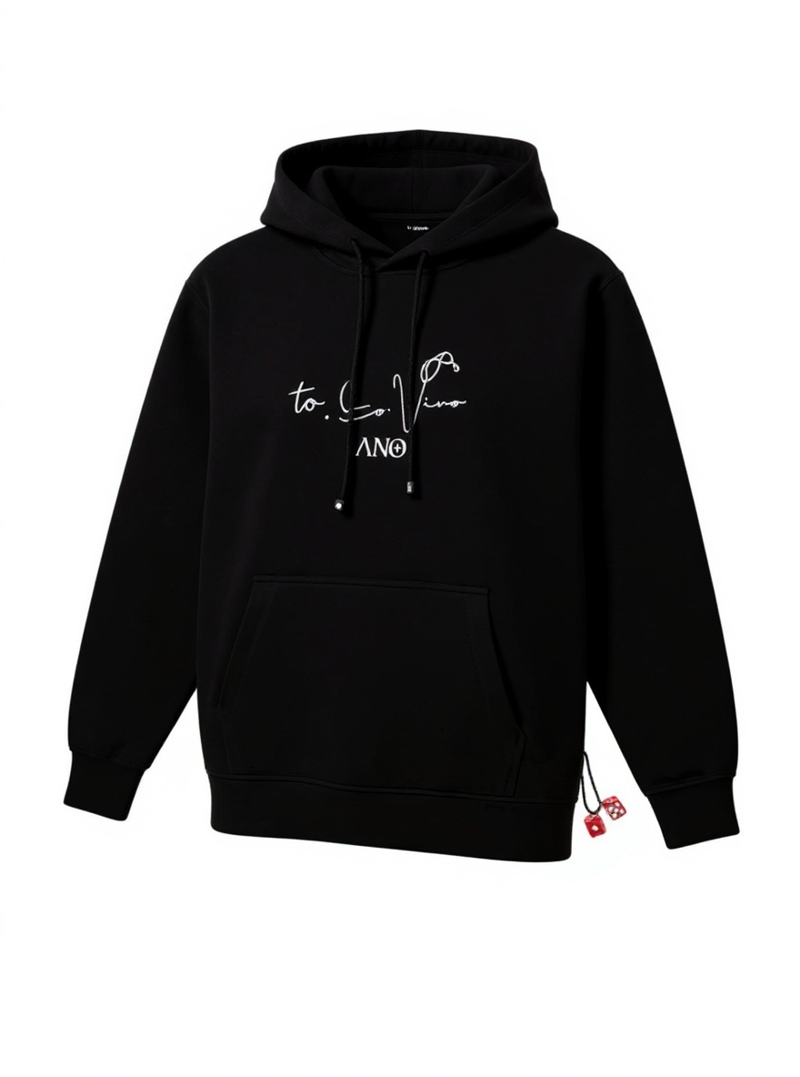 Bold black hoodie featuring a full-back design with playing cards, dice, and poker chips in striking red, white, and black tones. Branded with Roberto Vino Milano graphics and intricate artwork for a standout streetwear statement.