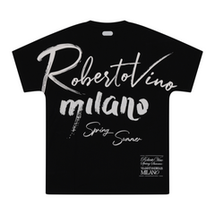 Add a touch of Italian sophistication to your wardrobe with the Roberto Vino T-Shirt in Milano Writing. This classic black t-shirt features a sleek design with the iconic Milano Writing logo on the front, adding a stylish flair to any outfit. Made from high-quality materials, this t-shirt is not only comfortable to wear but also durable enough to withstand daily wear and tear. Whether you're dressing up for a night out or keeping it casual on the weekends, the Roberto Vino T-Shirt is a versatile and stylish addition to any wardrobe.