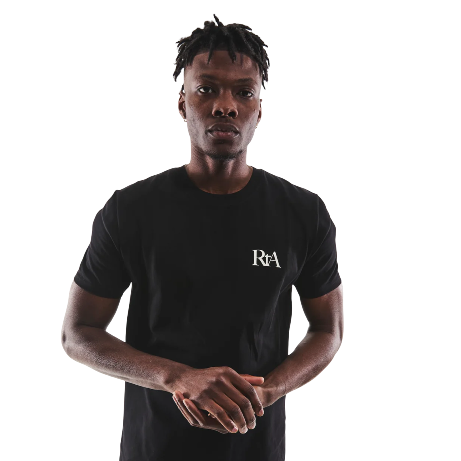 The Liam Short Sleeve Tee in Black Paradise is a regular fit, crew neck tee made from 100% cotton featuring a small RTA logo on the chest and a deconstructed PARADISE print, stacked and staggered in an abstract layout with the signature RTA crosses.