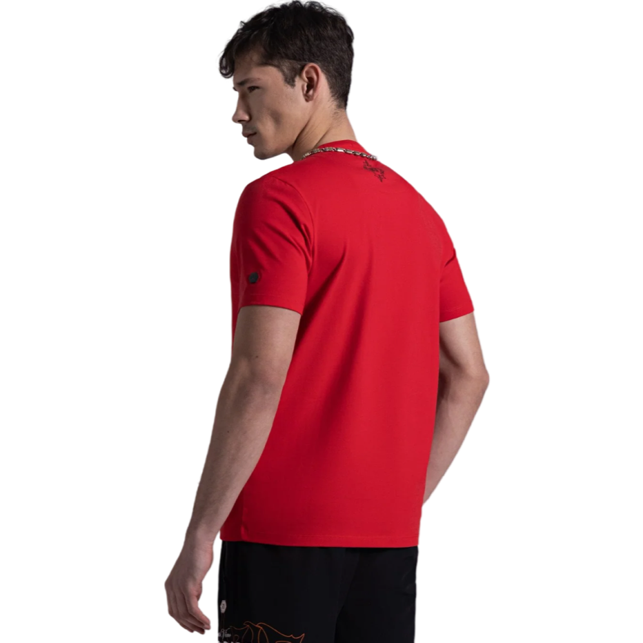 Introducing the Red RV Front T-Shirt, crafted from 95% cotton and 5% lycra for superior comfort. Featuring the iconic hexagonal RV logo on the front. Modeled by a 6-foot figure in size L, it's the perfect choice for effortless yet sleek attire.