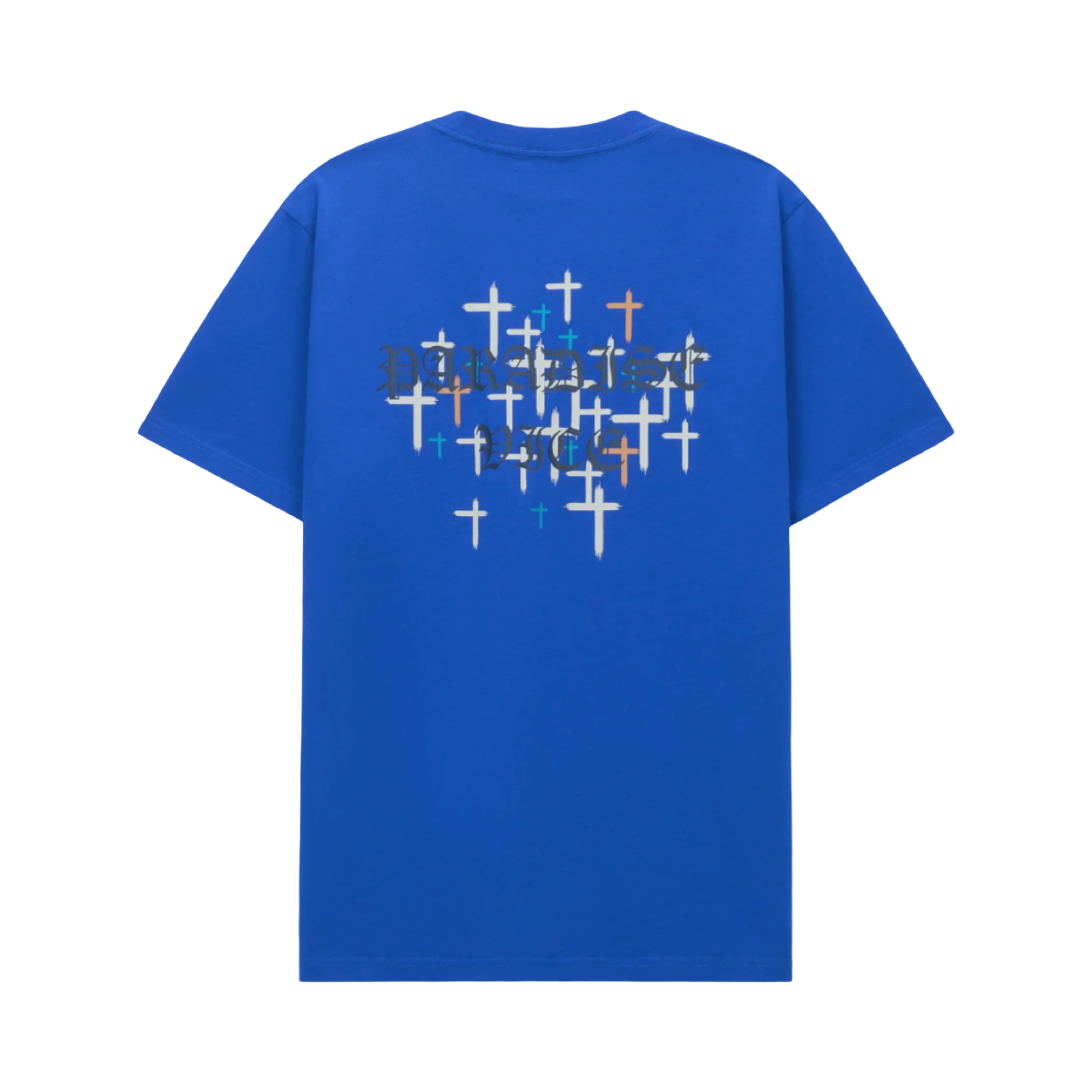 The Liam Short Sleeve Tee in Navy Old English Paradise is a crewneck, short sleeve tee made from 100% Cotton. This tee features the RTA logo in Old English font on the chest and a multi-colored cross motif with PARADISE written in matching font across the back.