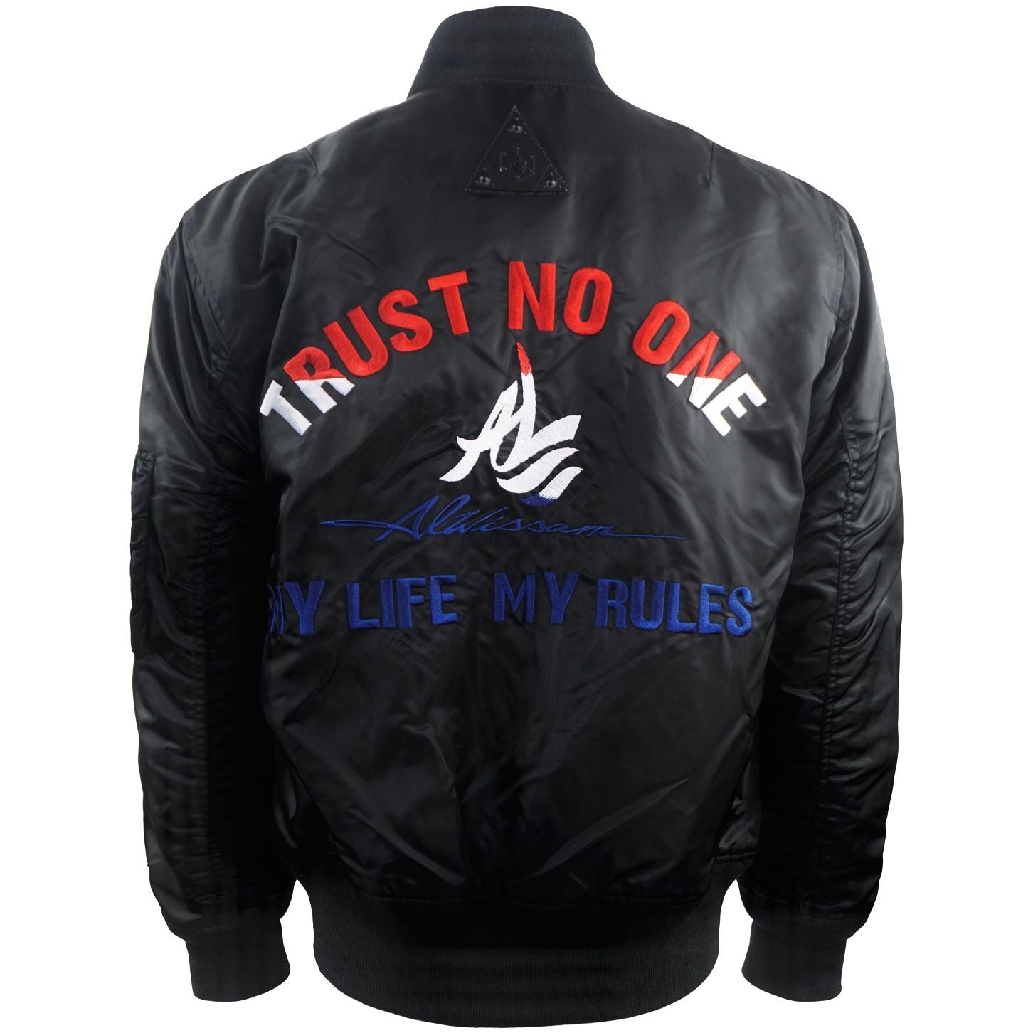 The jacket proudly showcases the compelling "Trust No One" design boldly printed on the back, serving as a reminder to stay true to yourself and trust your instincts. Embrace empowerment with the AL Logo design accompanying it, a symbol of authenticity and excellence.