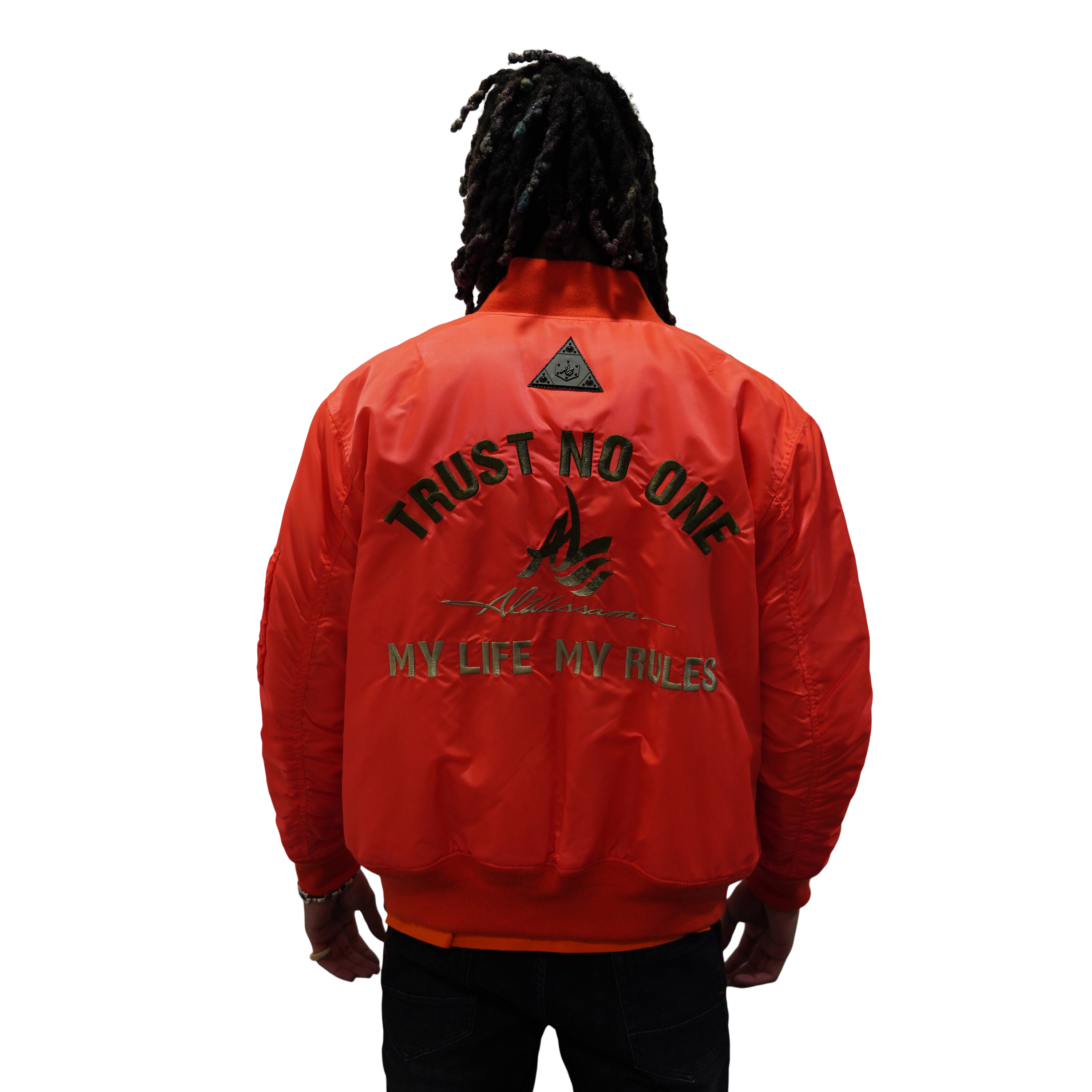 The jacket proudly showcases the compelling "Trust No One" design boldly printed on the back, serving as a reminder to stay true to yourself and trust your instincts. Embrace empowerment with the AL Logo design accompanying it, a symbol of authenticity and excellence.