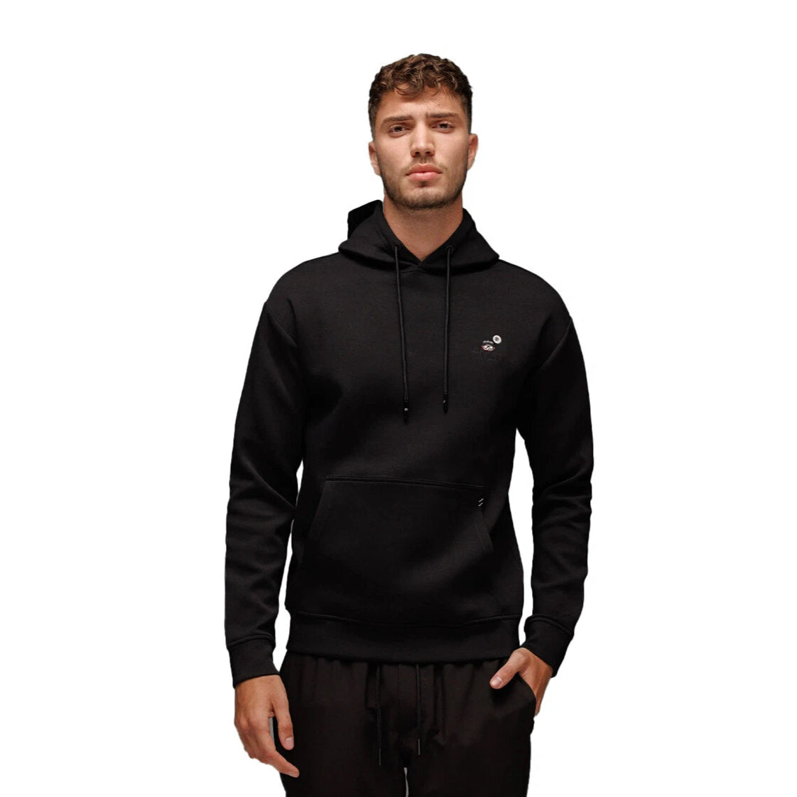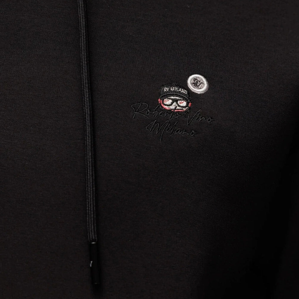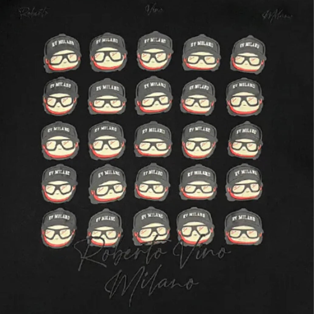 The Vino Faces Hoodie by Roberto Vino showcases a striking design with rubberized Vino head motifs arranged in a five-by-five grid on the back, delivering a bold and textured look. On the front, near the left shoulder, a small Vino face logo is accompanied by the text "Roberto Vino Milano," adding a refined branding detail. This hoodie expertly blends artistic expression with premium craftsmanship, offering both comfort and distinctive style.