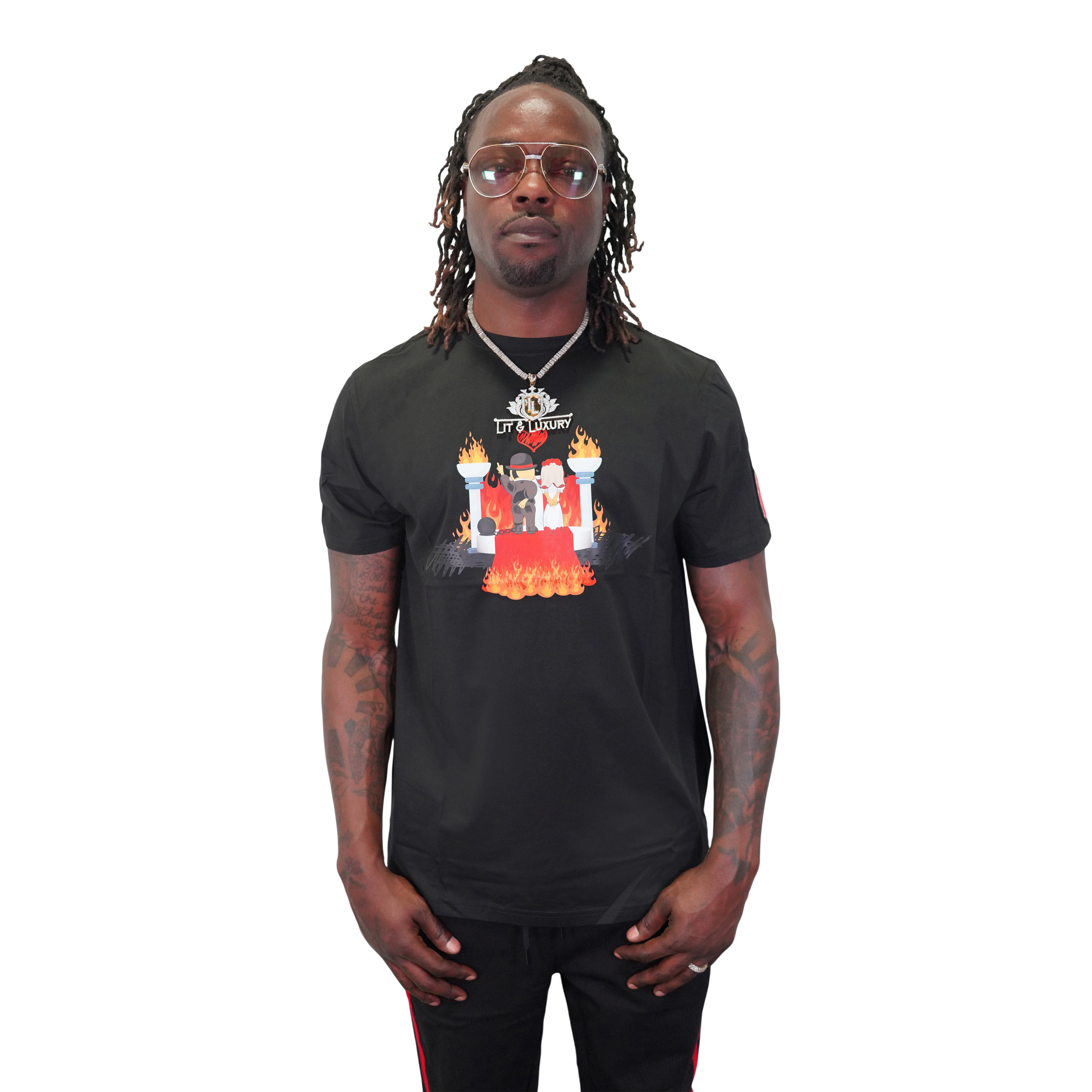 This tee captures the essence of a sacred union. Featuring a husband and wife exchanging vows against a backdrop of flames, it's a visual representation of the fiery passion that accompanies the journey of love and commitment.