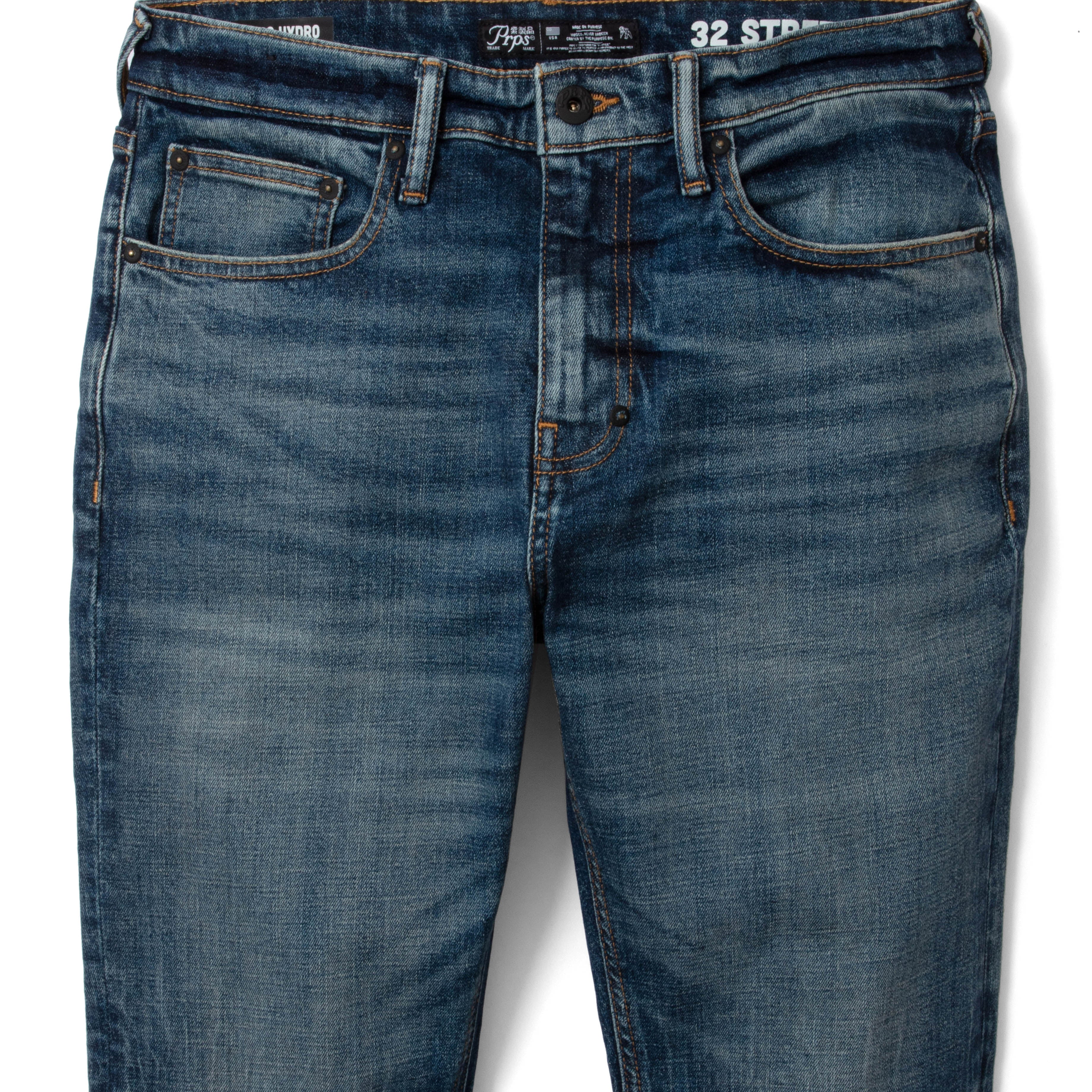 Our Viability Jeans are a medium wash denim with a tapered skinny stretch fit. Part of our Sustainable / Hydro PRPS line, these men's jeans are low impact on the environment and feature a vegan leather back patch.